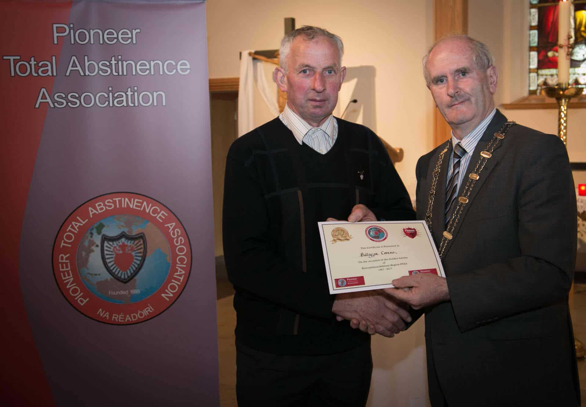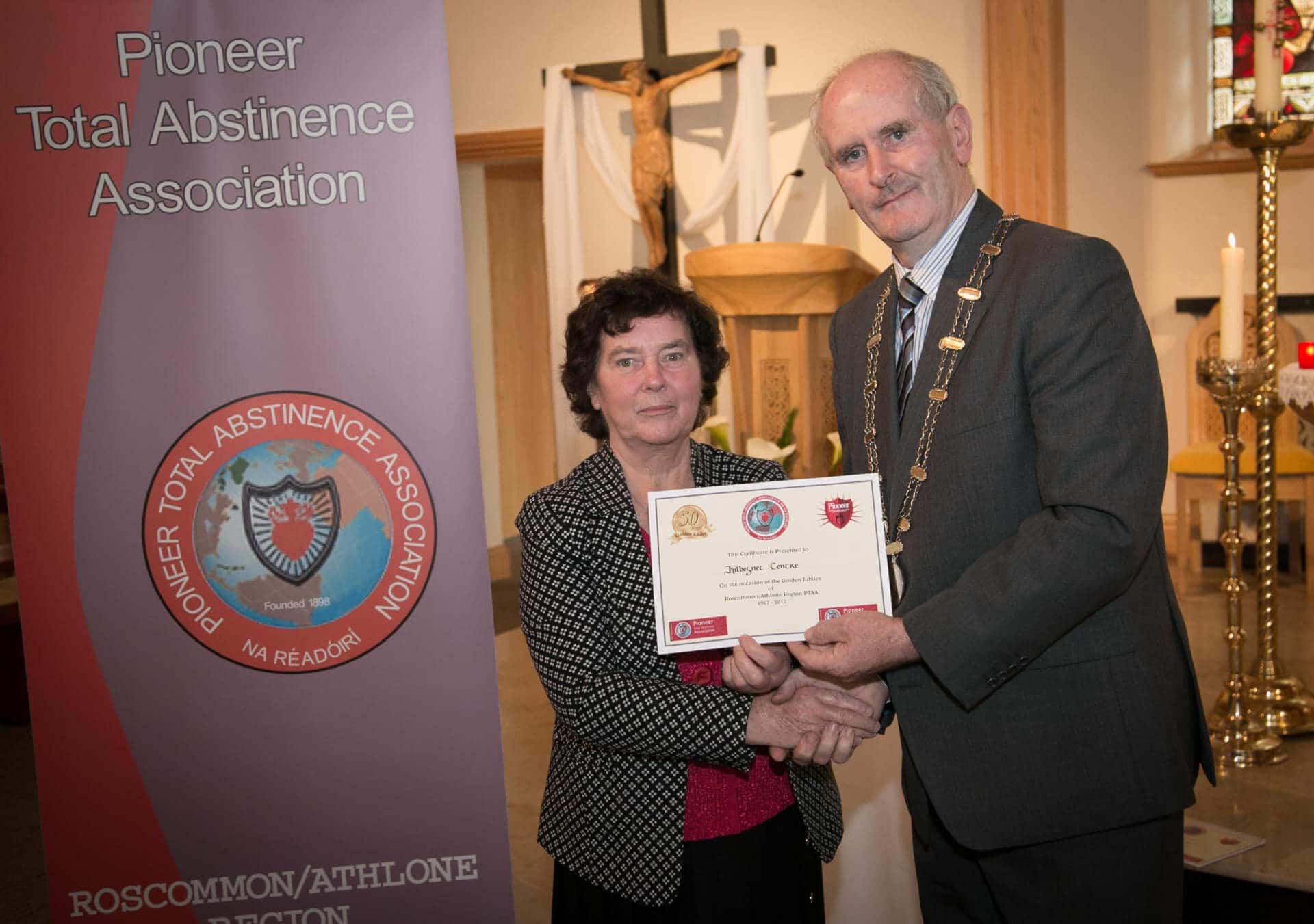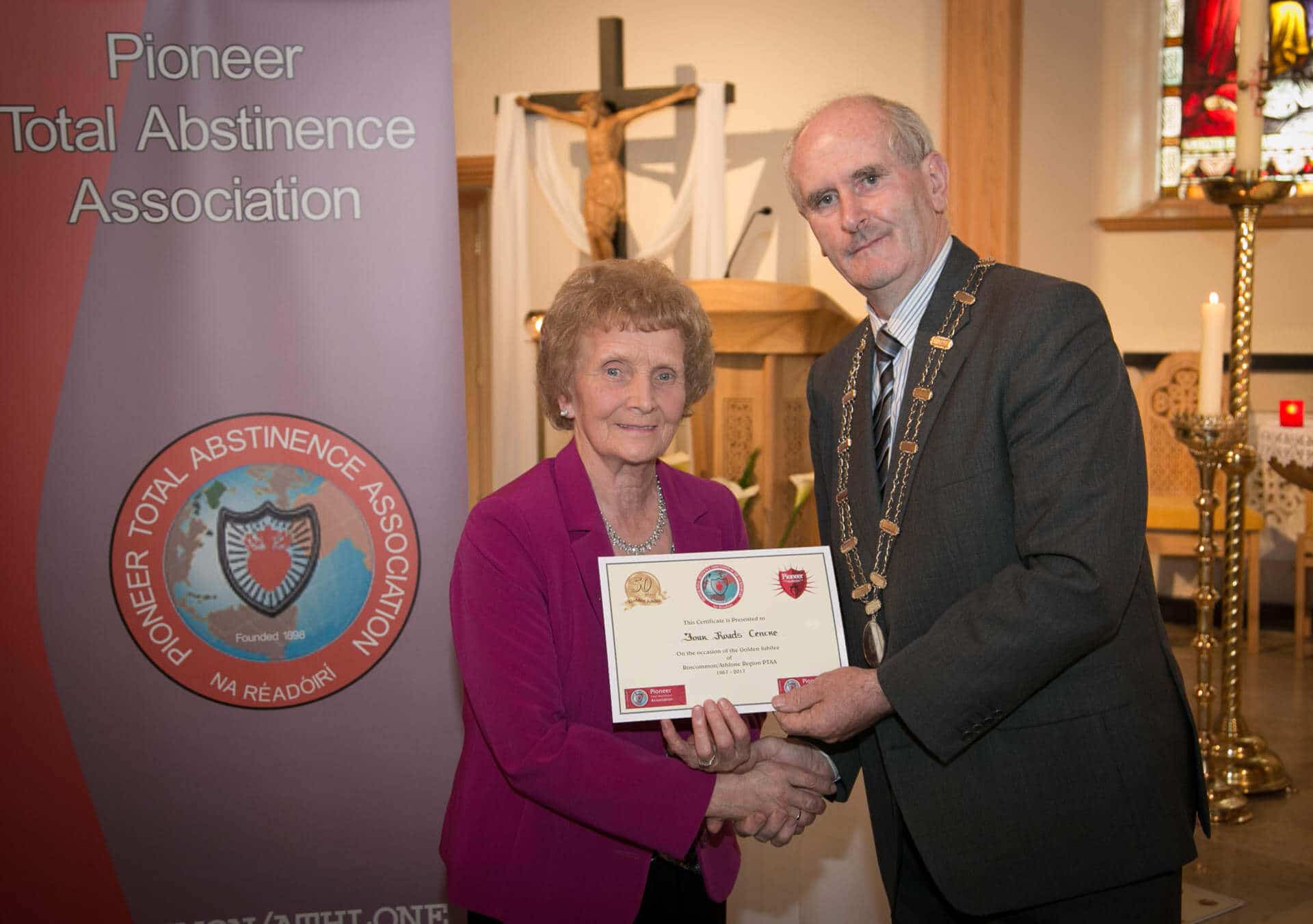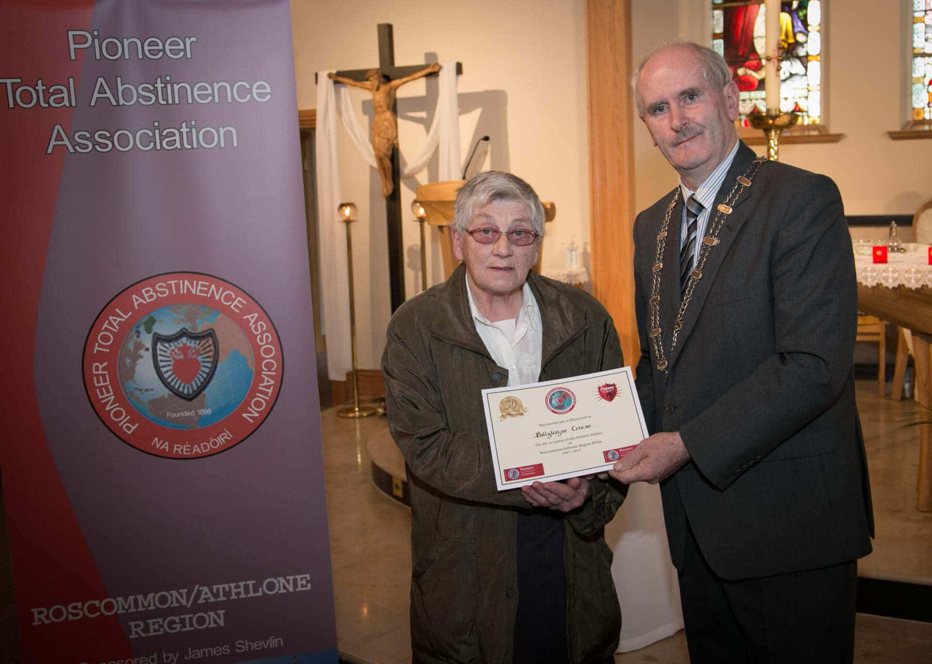 National President and Roscommon/Westmeath Regional President of PTAA James Shevlin made presentations to 20 local Pioneer Total Abstinence Association Branches in the Church Of The Risen Christ, Kiltoom recently.