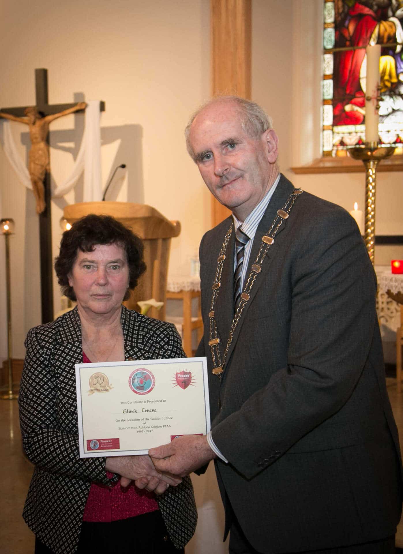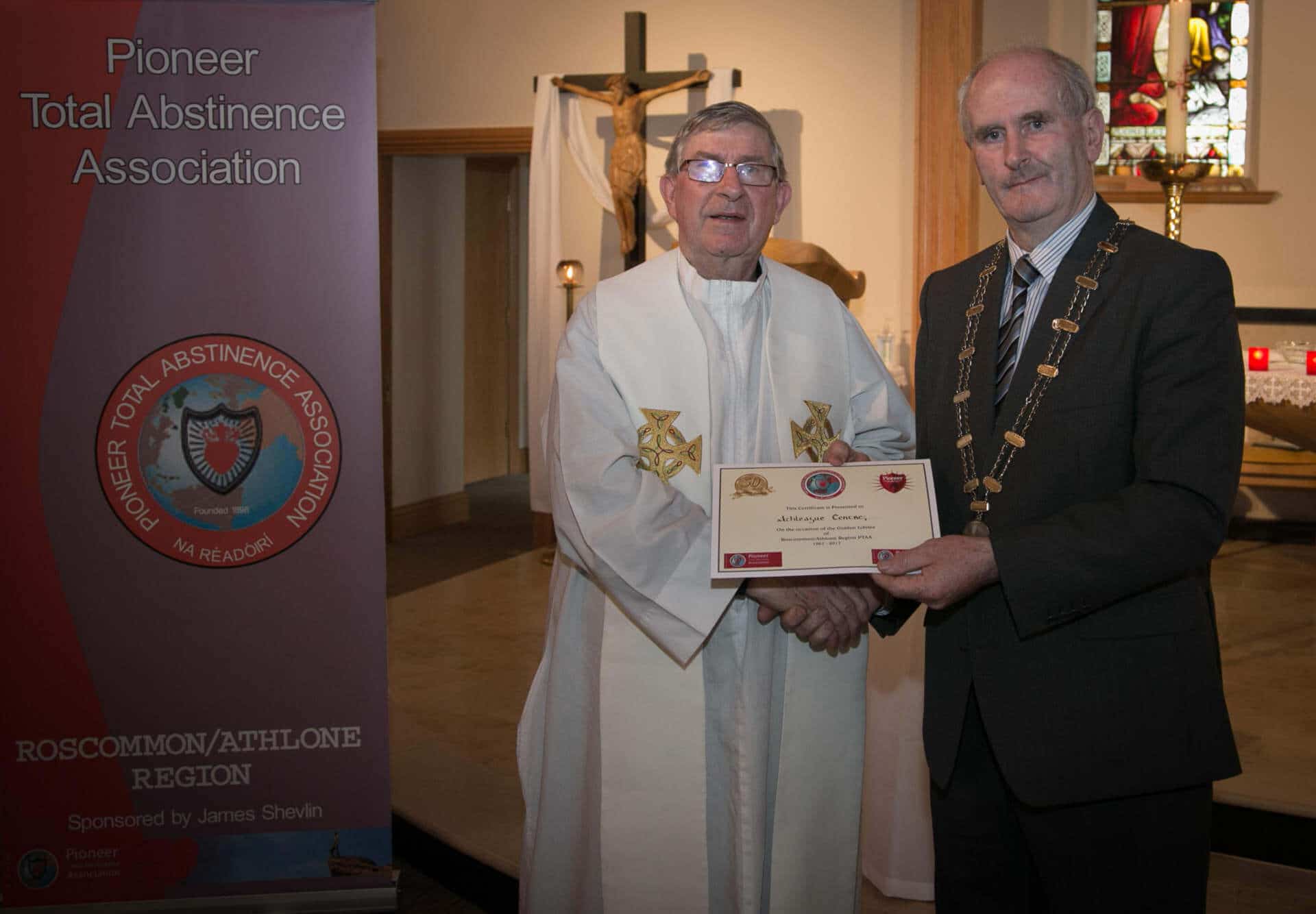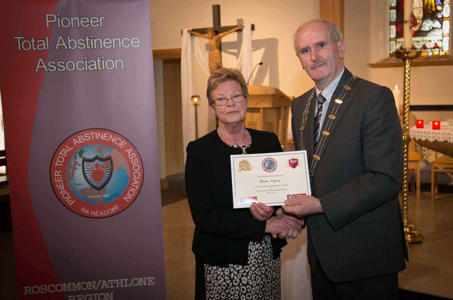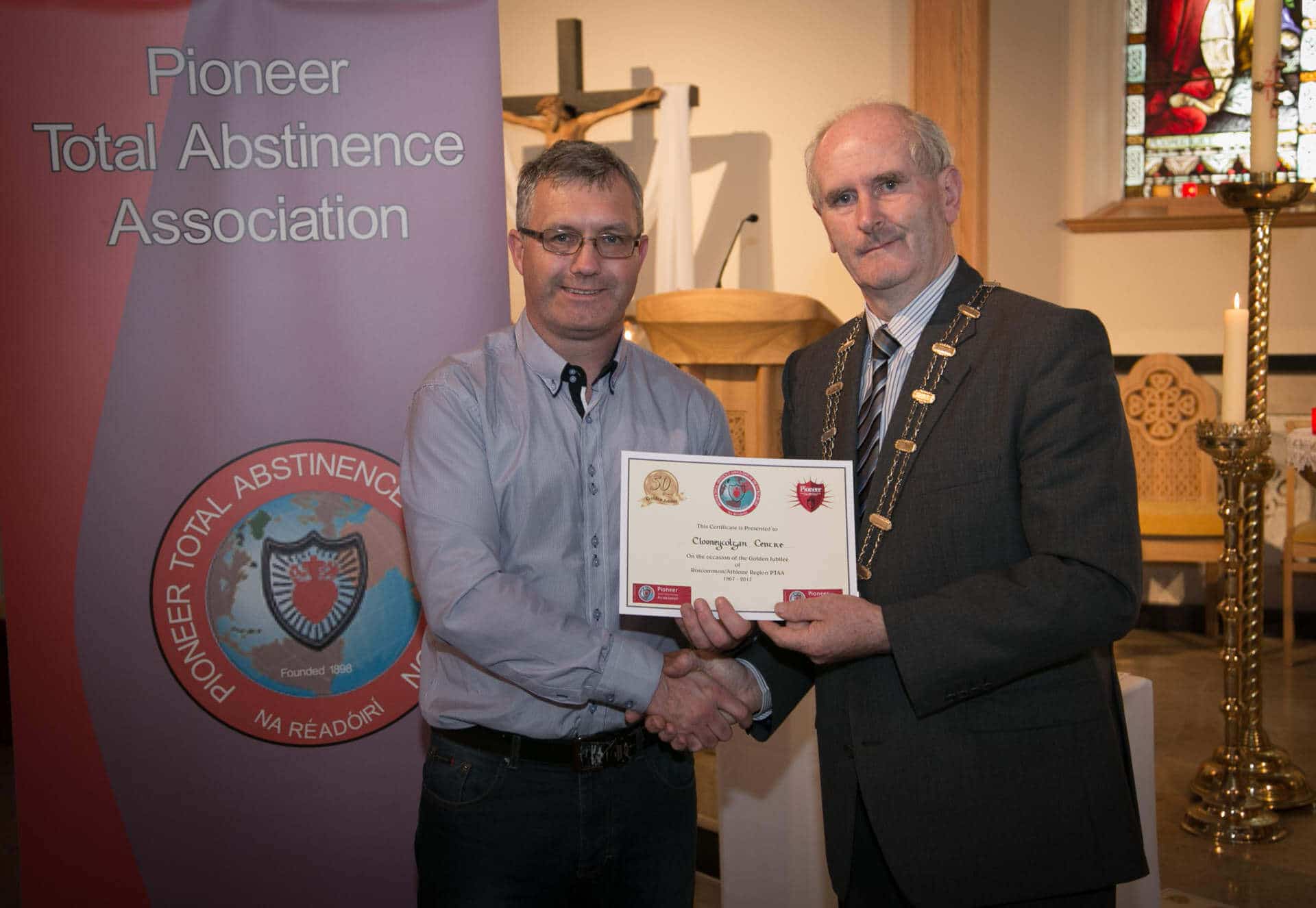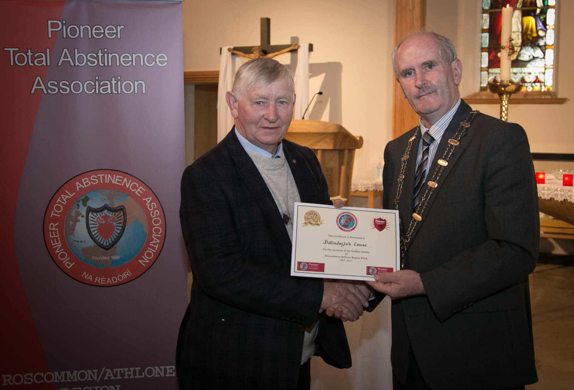 National President and Roscommon/Westmeath Regional President of PTAA James Shevlin made presentations to 20 local Pioneer Total Abstinence Association Branches in the Church Of The Risen Christ, Kiltoom recently.