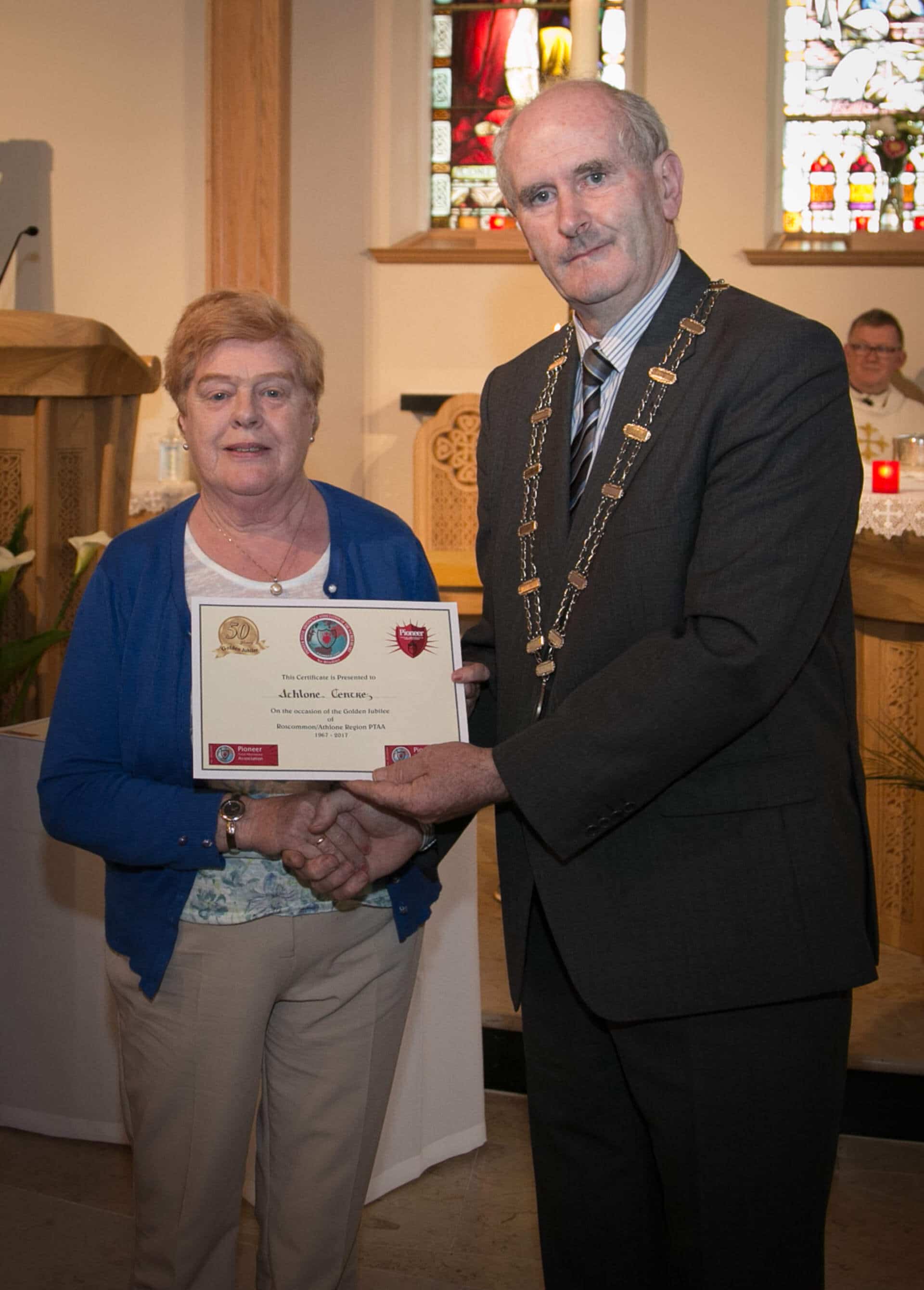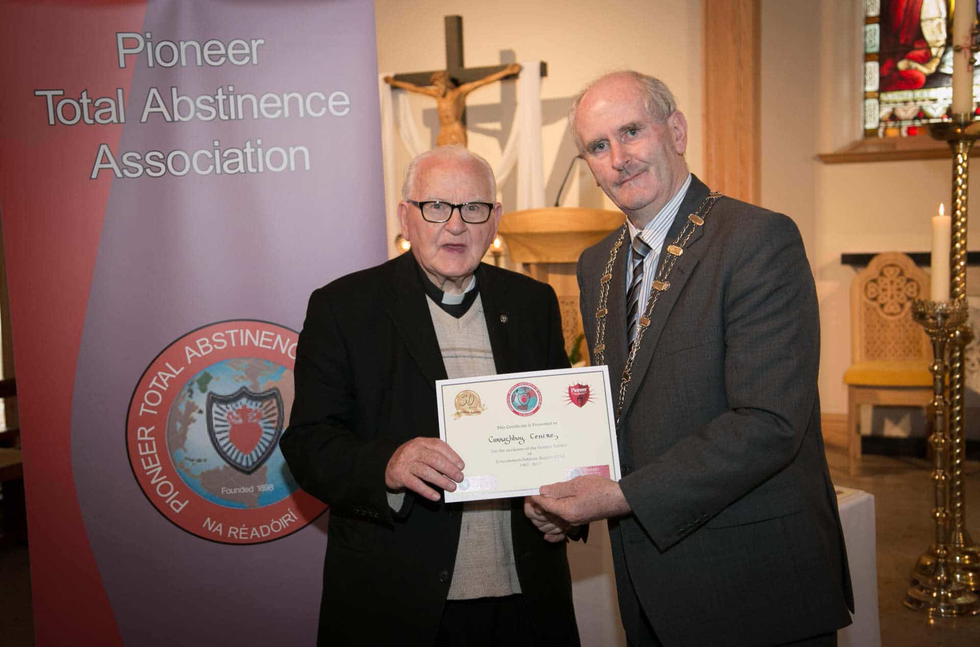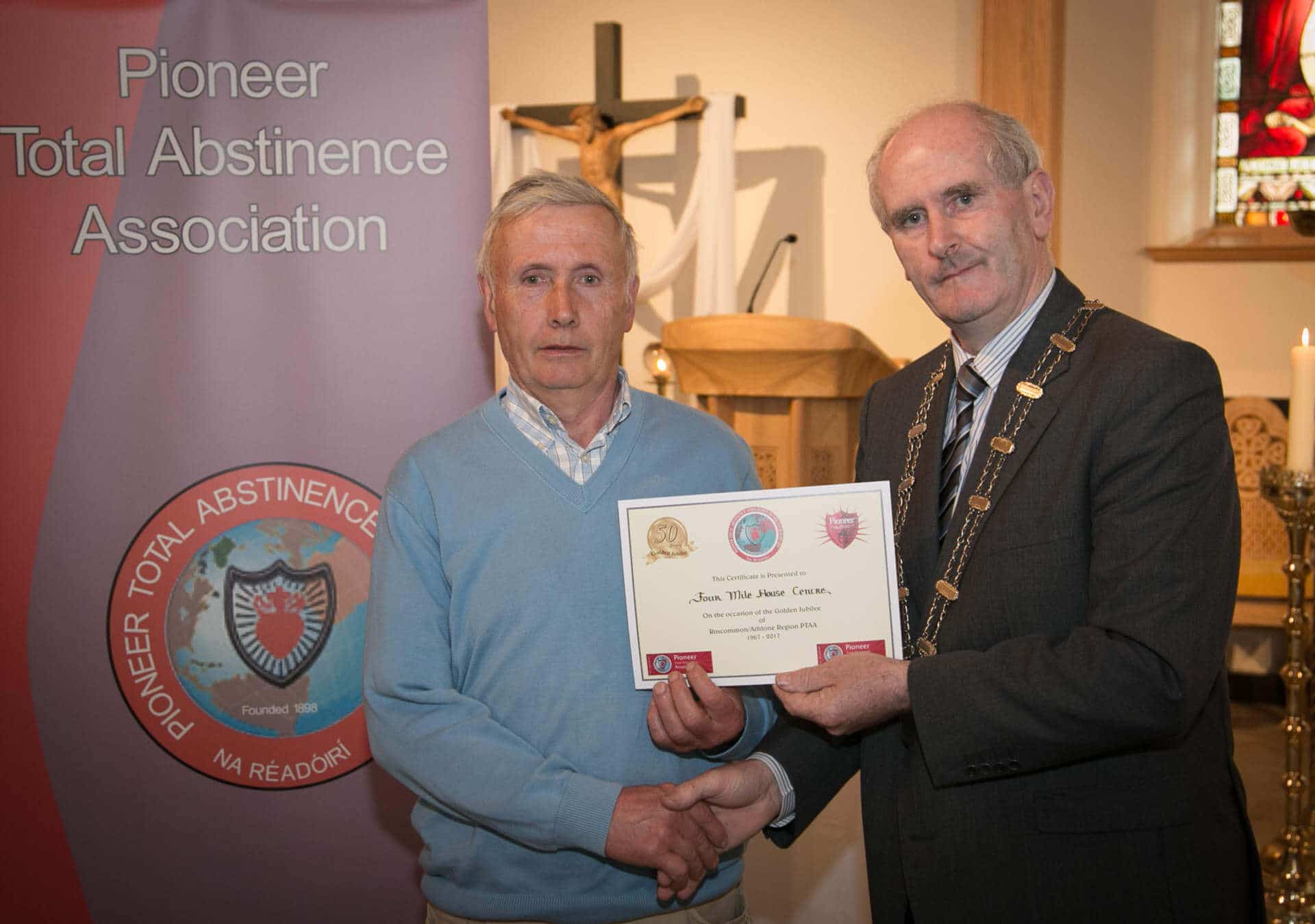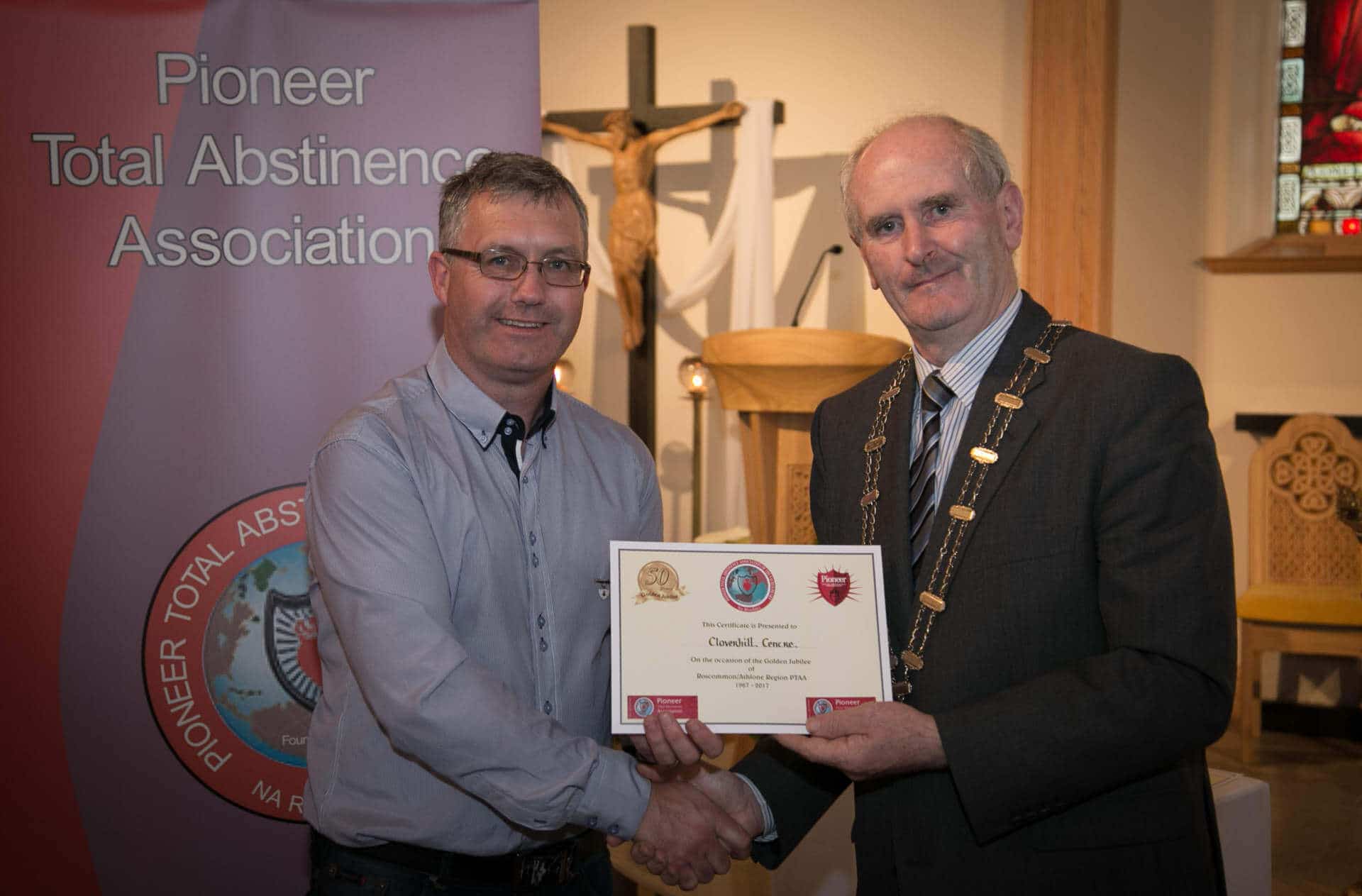 National President and Roscommon/Westmeath Regional President of PTAA James Shevlin made presentations to 20 local Pioneer Total Abstinence Association Branches in the Church Of The Risen Christ, Kiltoom recently.