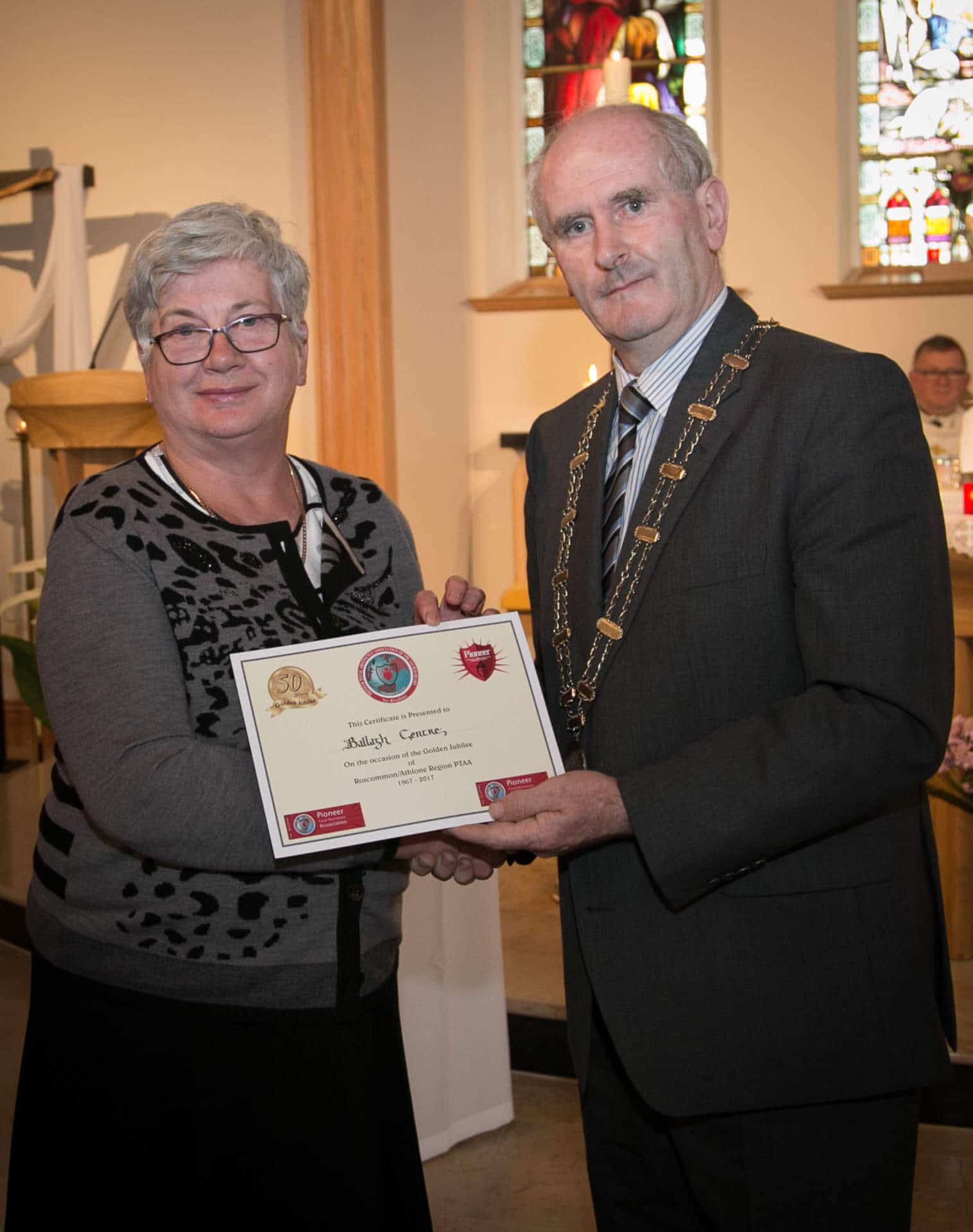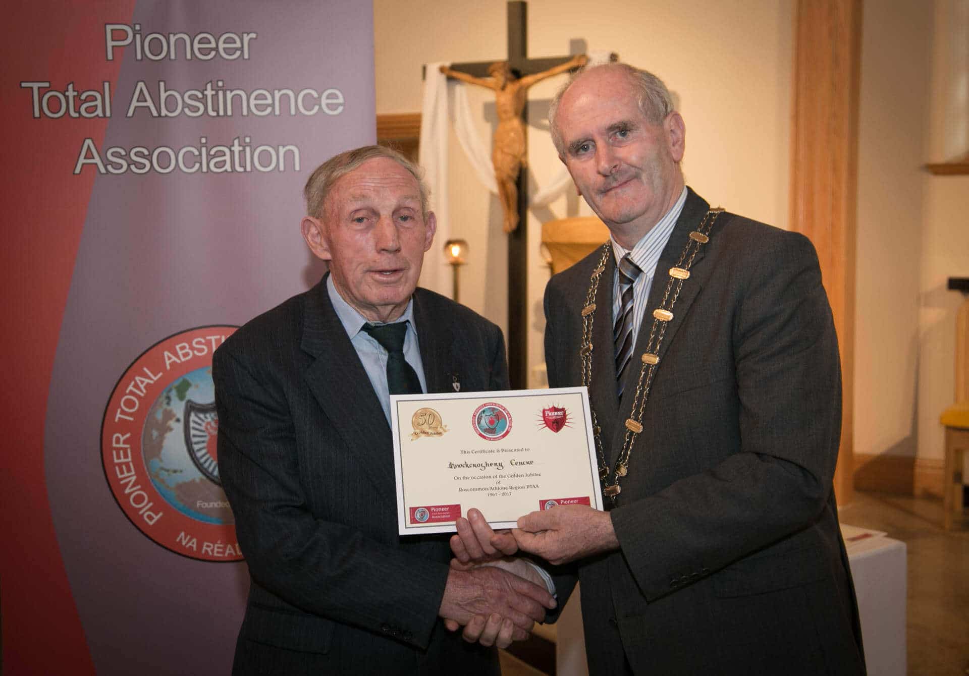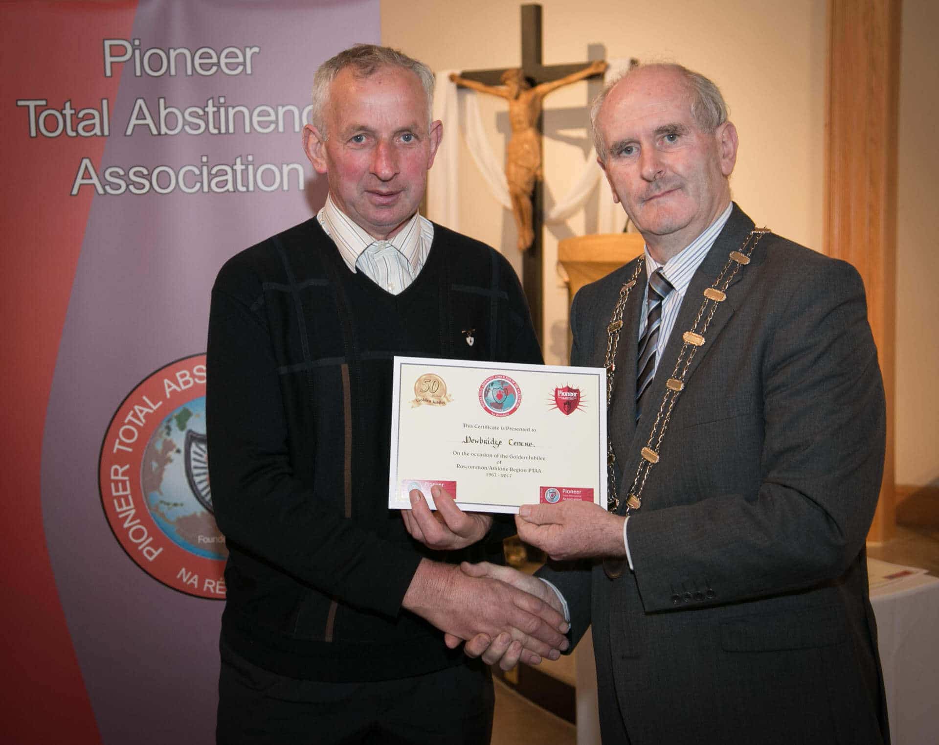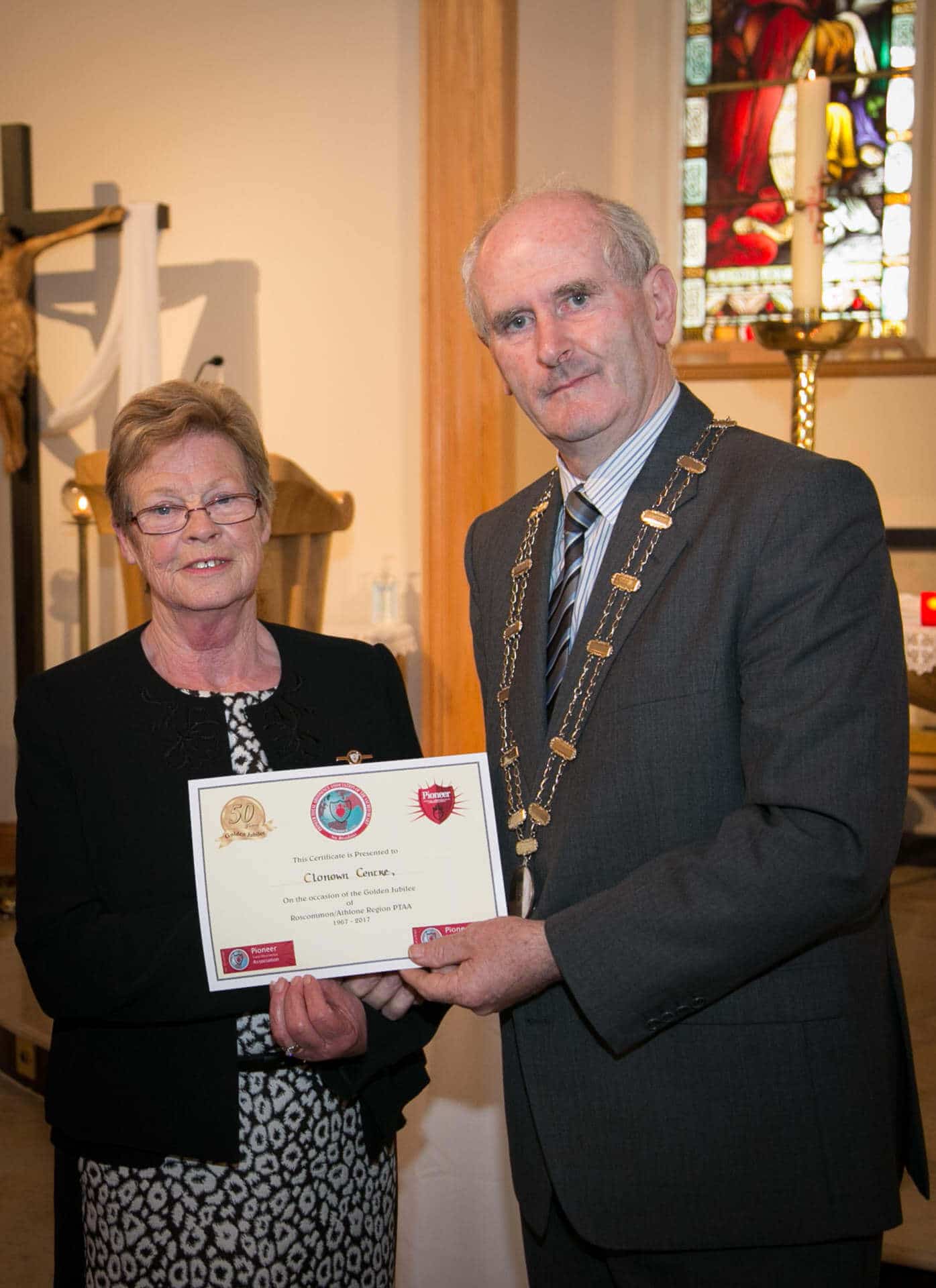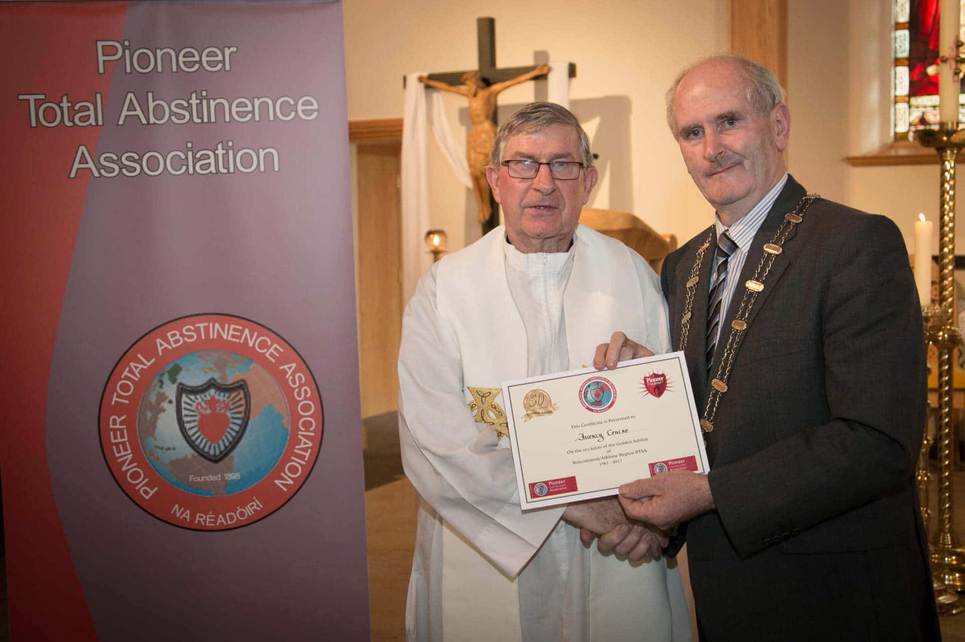National President and Roscommon/Westmeath Regional President of PTAA James Shevlin made presentations to 20 local Pioneer Total Abstinence Association Branches in the Church Of The Risen Christ, Kiltoom recently.